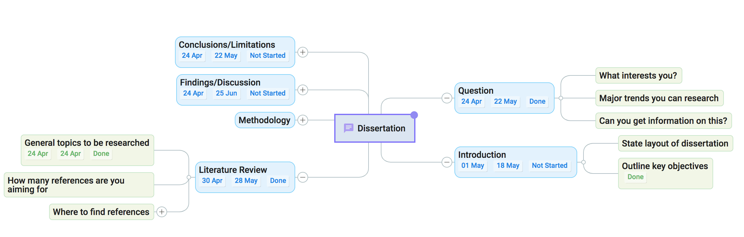 The many different areas of a Dissertation is ideal for the using a Mindmap. As shown in the image above, whether you are in the Literature Review stage or working on your Methodology, it is easy to go between topics and brainstorm your ideas into dedicated areas.
